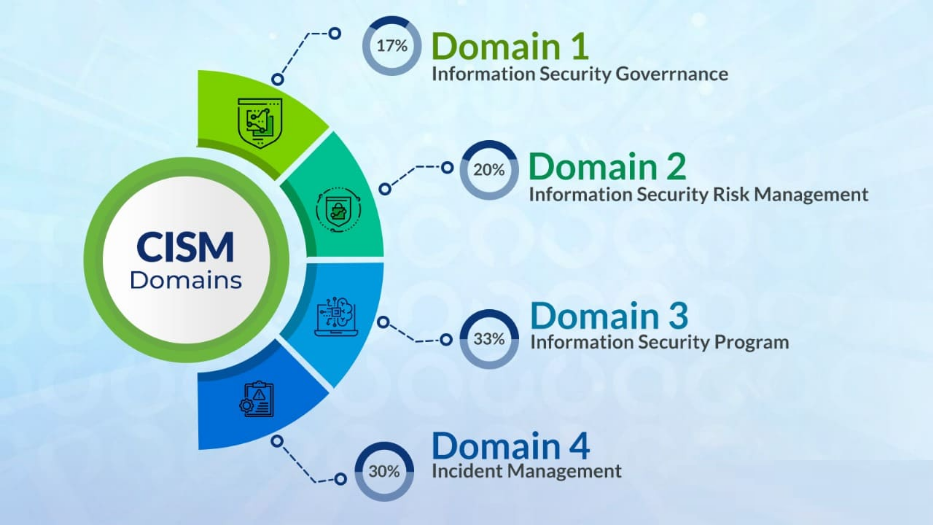 CISM بر چهار حوزه اصلی تمرکز دارد که هر یک نقش کلیدی در مدیریت امنیت اطلاعات ایفا می‌کنند. اولین حوزه، مدیریت امنیت اطلاعات  (Information Security Governance)بر ایجاد چارچوب‌ها و سیاست‌هایی متمرکز است که تضمین می‌کند برنامه‌های امنیتی با اهداف کلان سازمان هم‌راستا هستند. این حوزه شامل توسعه استراتژی‌های امنیتی، تعریف نقش‌ها و مسئولیت‌ها، و اطمینان از پشتیبانی مدیریت ارشد است. دومین حوزه، مدیریت ریسک اطلاعات (Information Risk Management)، به شناسایی، ارزیابی و کاهش ریسک‌های امنیتی می‌پردازد. متخصصان در این حوزه باید بتوانند تهدیدات بالقوه را شناسایی کرده و اقدامات پیشگیرانه‌ای برای کاهش تاثیر آن‌ها طراحی کنند.